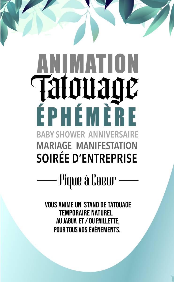 Le salon Pique à coeur Ink situé à Bordeaux rive droite propose des prestations de tatouages éphémères aux particuliers ou aux entreprises pour des séminaires, soirée d'entreprise, évènementiels, festivals, mariages ou anniversaires d’enfants.. en extérieur ou en intérieurs.